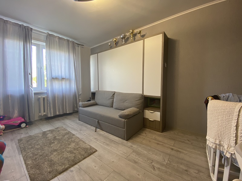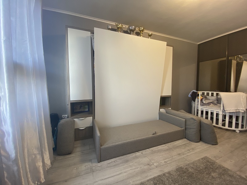 Стояла задача разместить кровать и зону для просмотра телевизора напротив. Убрав кровать хотелось бы присесть, чтобы комфортно встречать гостей, смотреть фильмы или читать книги. С этой целью изготовили небольшой диван.
