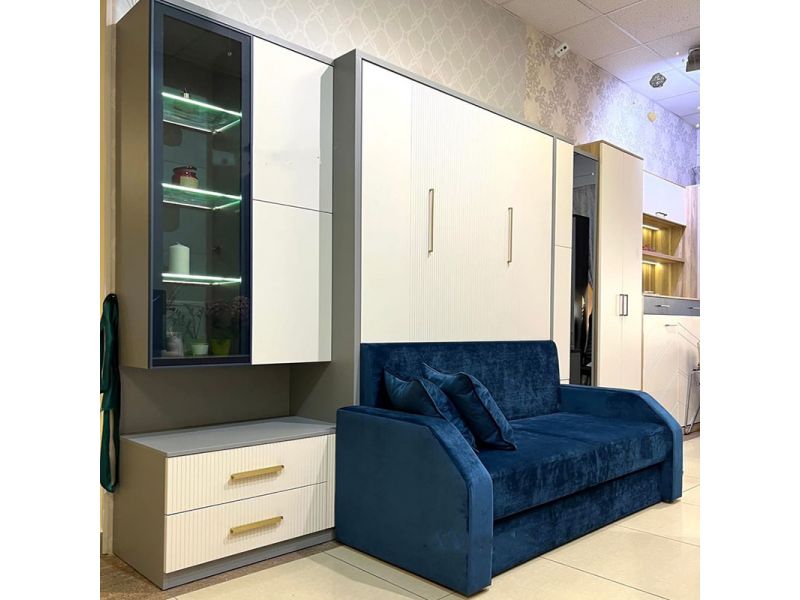 Прекрасно подходит для спальни, или однокомнатной квартиры-студии. Ведь, кровать трансформер компактная, расположена вертикально, а диван не выходит за габариты кровати. В прилегающих шкафчиках под стеклом уместно размести посуду или коллекции и ваши награды. Шуфляды - заменят комод. Закрытые пеналы - книги, швейные принадлежности.