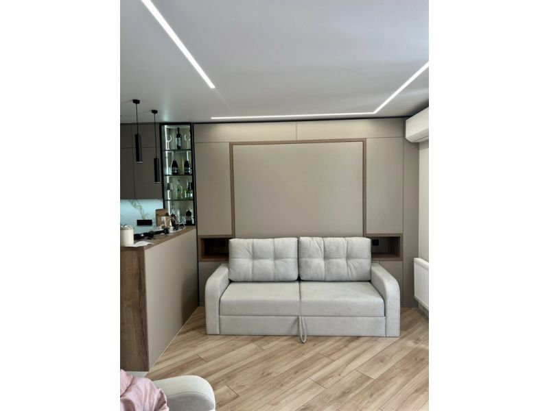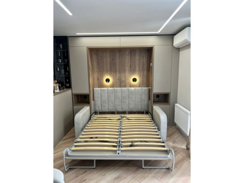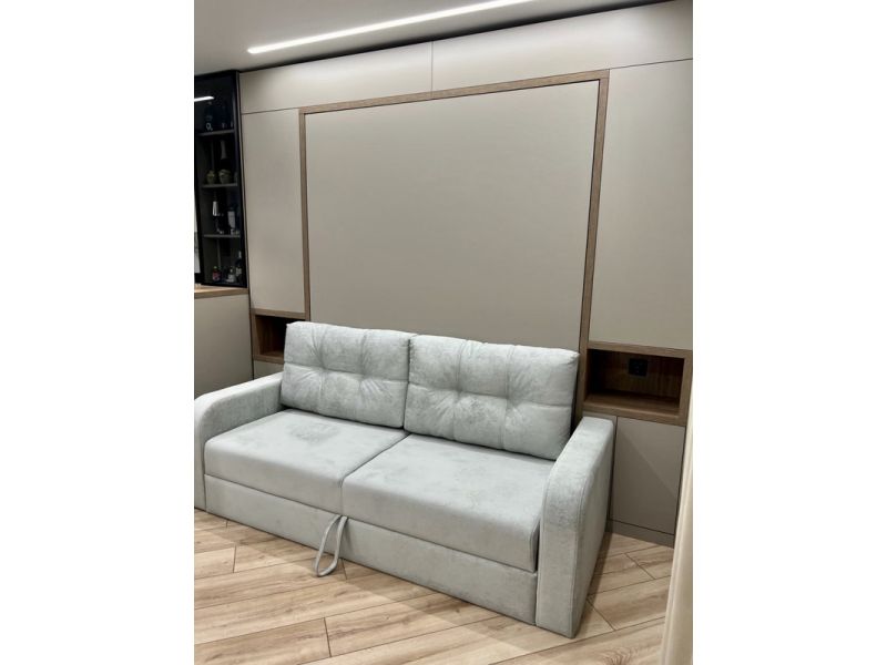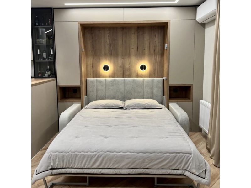 Решение: Комплекс из вертикальной кровати с инновационной системой открывания, удобного дивана и продуманной системы хранения.