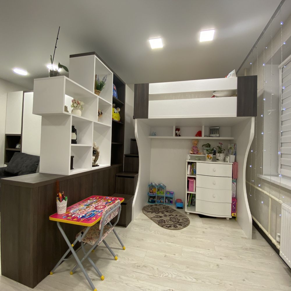 Выполнена из ЛДСП контрастных цветов. Детская была зонирована перегородкой.
