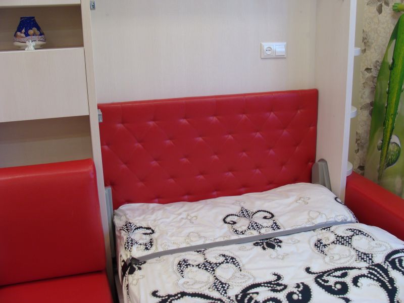 Мы установили 2 шкаф-кровати, объединенные 1 диваном, постельные принадлежности можно оставлять в кровати и есть ящики для хранения. Кровати разделены пеналом с полками для хранения учебников. Письменные столы под окном. Большой шкаф-купе для одежды и обуви детей.