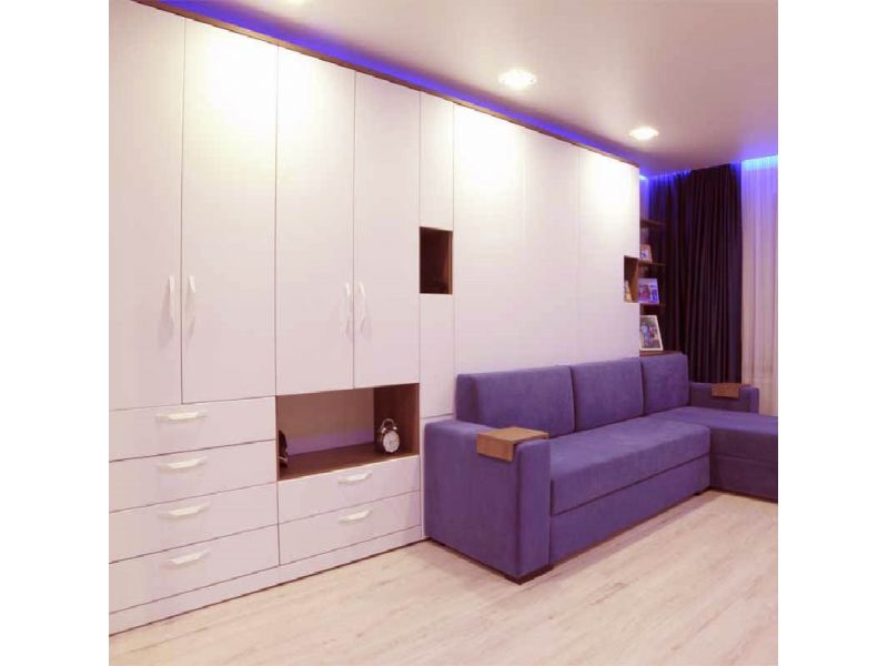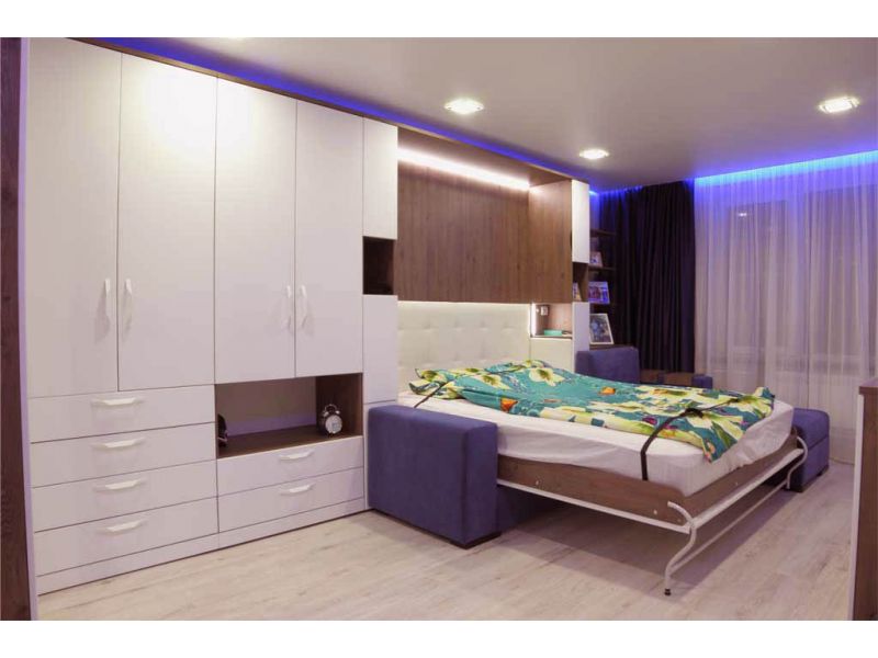 Сочетает в себе шкафы для одежды и шуфляды, полноценную двуспальную кровать и вместительный яркий диван.