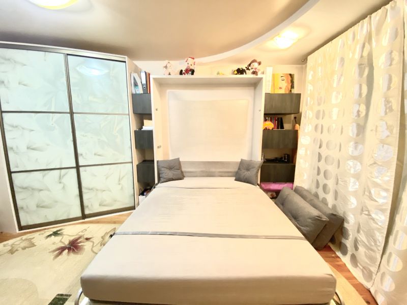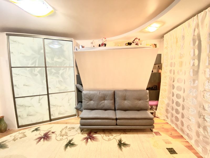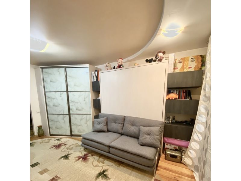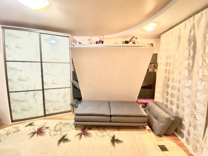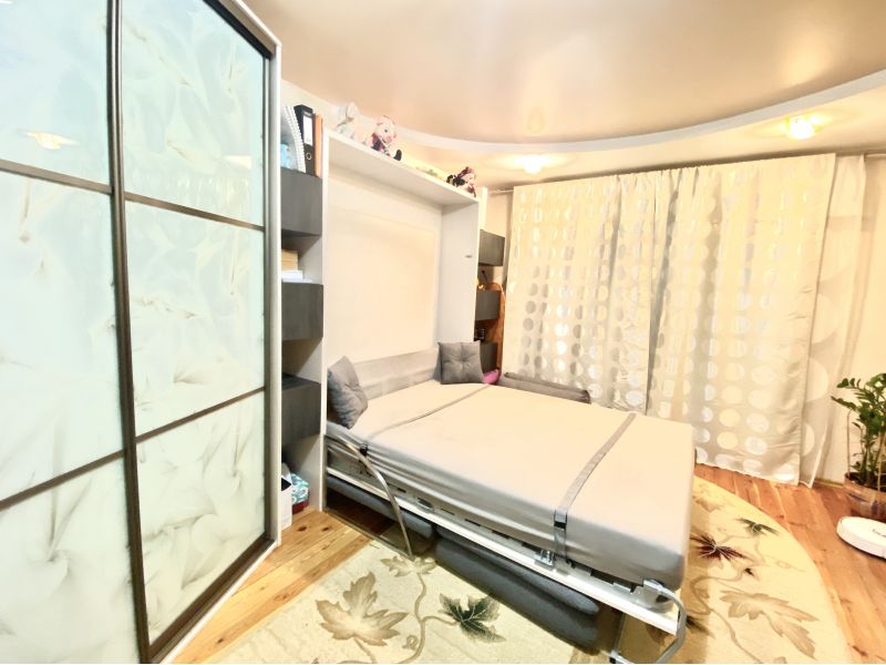 Стаяла задача к имеющемуся шкаф-купе до изготовить стенку с кроватью-трансформер и диваном на металлокаркасе. Выполняли в два этапа. Сначала изготовили шкаф-кровать с комбинированными пеналами. После прошествию нескольких месяцев, семья заказчиков оценила необходимость дивана, т.к. в комнате стало сложно смотреть телевизор. В момент, когда кровать была собрана, присесть в комнате семье было не где.