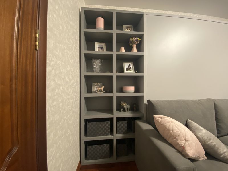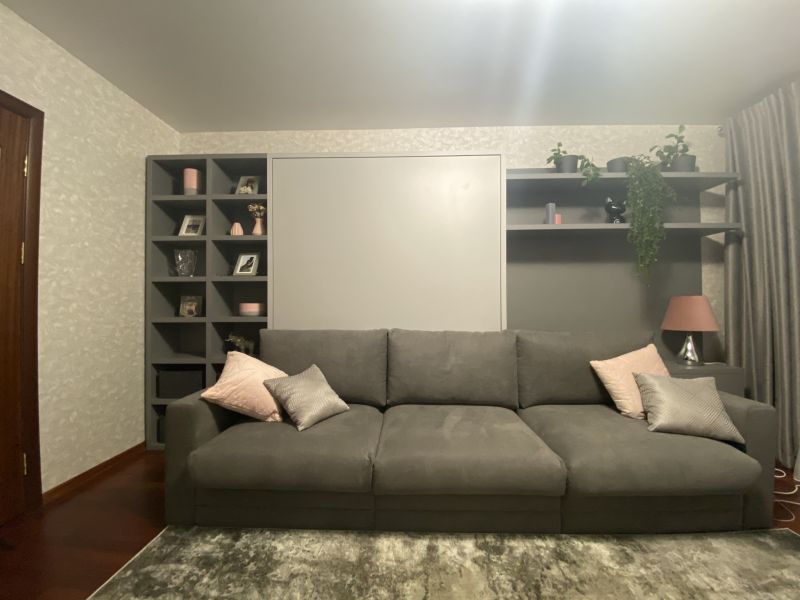 Реализовано: двуспальная кровать трансформер с диваном и полками в серо-розовых тонах с декоративными нежно-розовыми подушками.