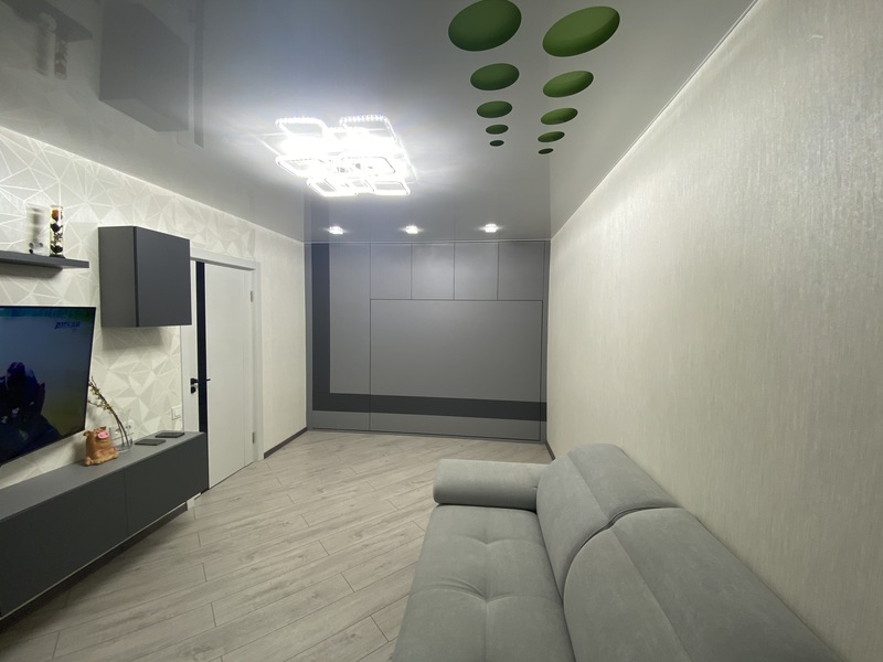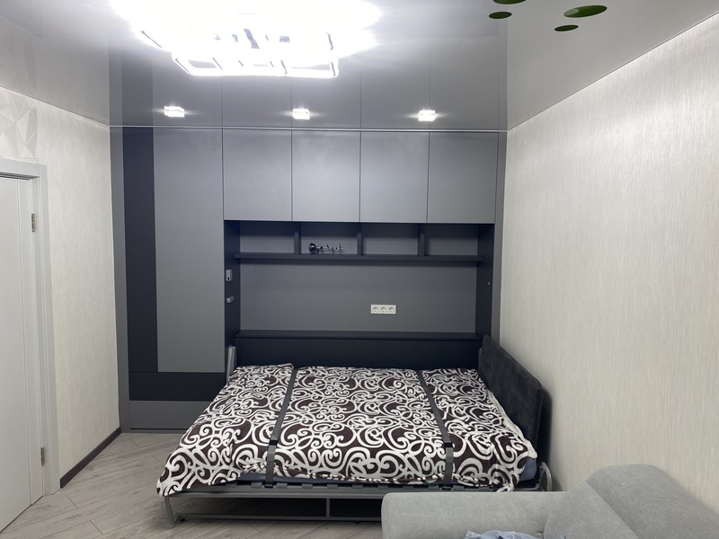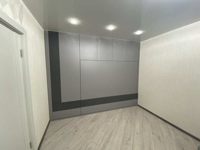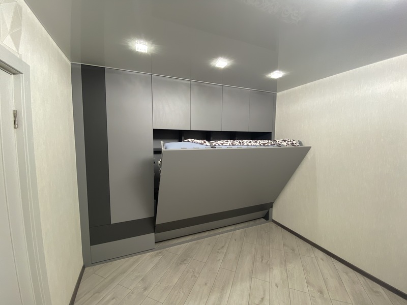Стояла задача разместить кровать трансформер и шкаф. Сделать их, как можно незаметными в комнате, например, за дверью в серых тонах.