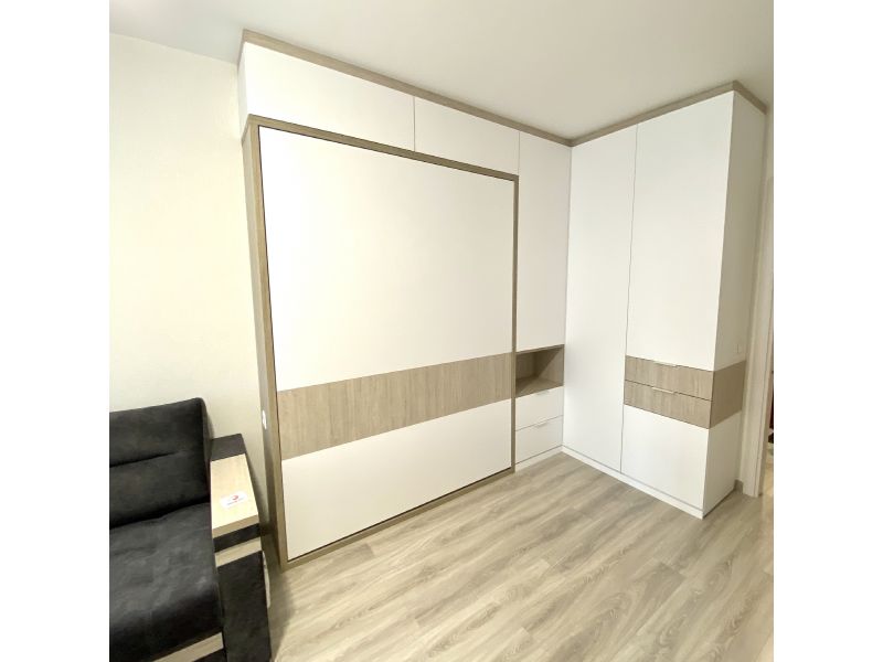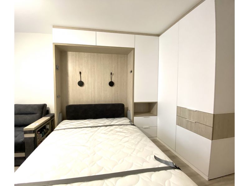 В данном случае диван находится напротив телевизора, потому что комната узкая, а так хочется вертикальную кровать.