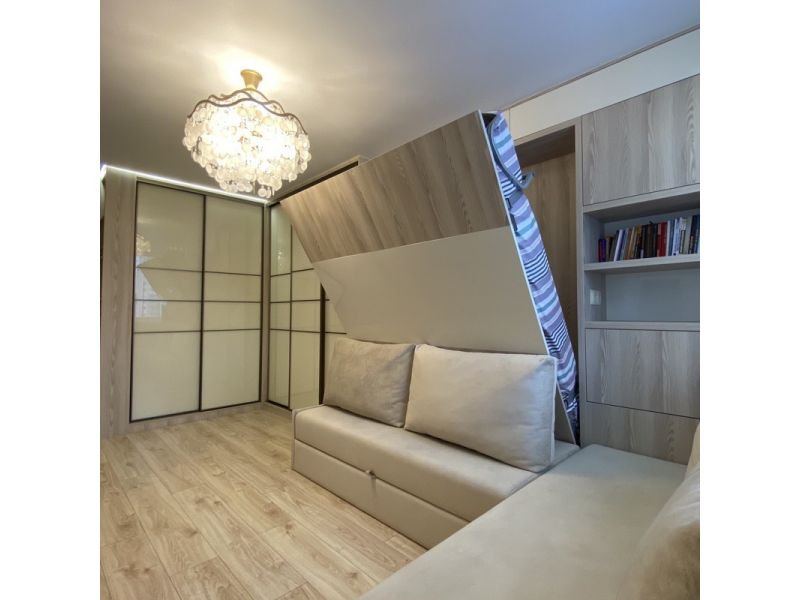 Мы изготовили кровать-трансформер со вставкой из МДФ, чтобы модель выступала парой для шкаф-купе.