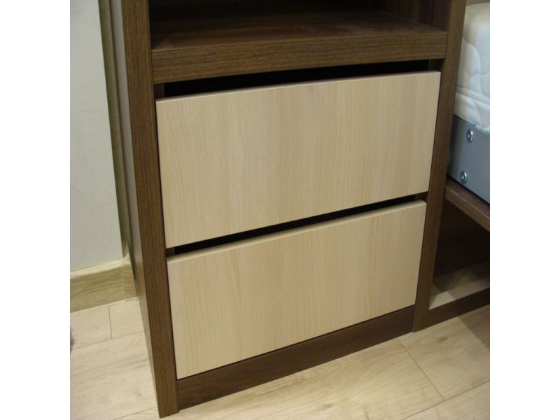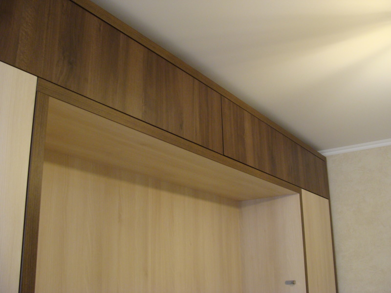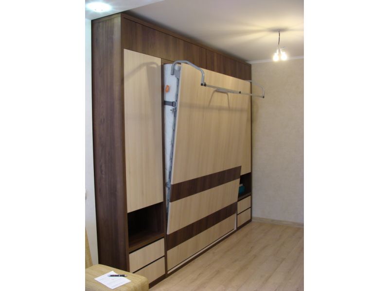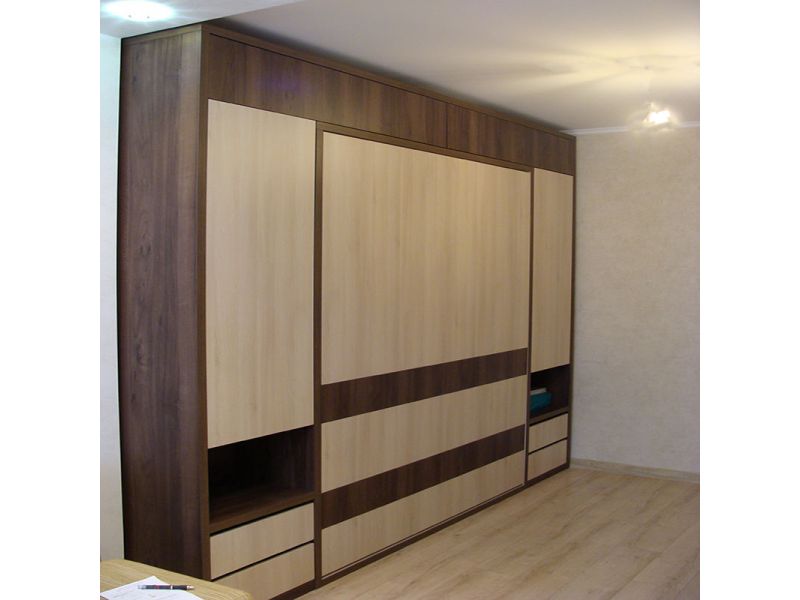 Стенка с кроватью трансформер и пеналами. Пеналы не имеют ручки, а лишь прорези для захвата: практично и удобно.