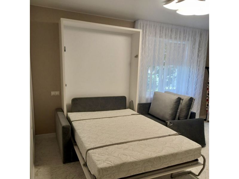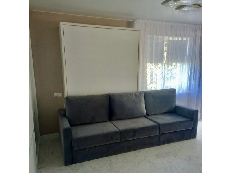 Кровать трансформер выполнена в нейтральных серо-белых тонах. Кровать имеет надежный механизм трансформации, с вертикальным типом открытия. Спальное место 1600 * 2000 мм. Белье фиксируется под ремнями. Диван большой. Подходит для гостиной.