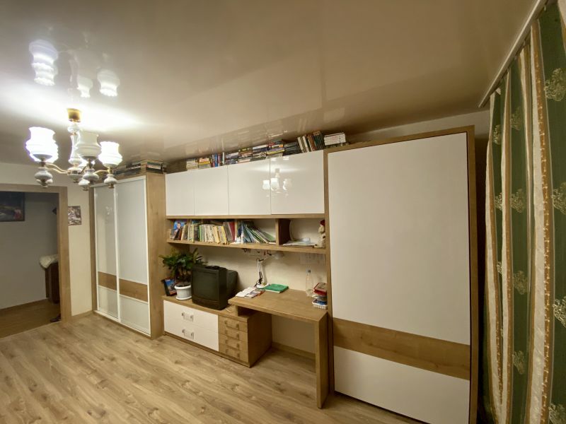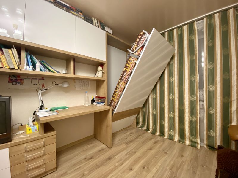 Реализовано: односпальная кровать трансформер для ребенка с ортопедическим матрасом вертикального хранения, письменный стол с навесными полками и шкаф-купе на 2 метра Все это выполнено в белом глянце в сочетании с древесным лдсп.