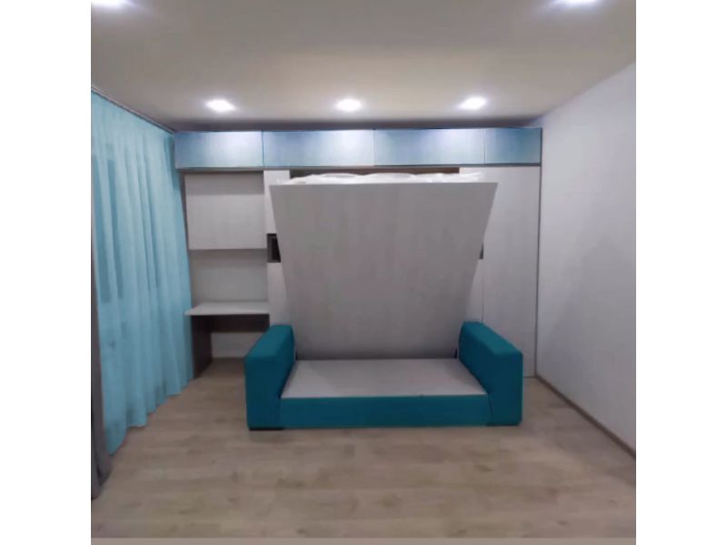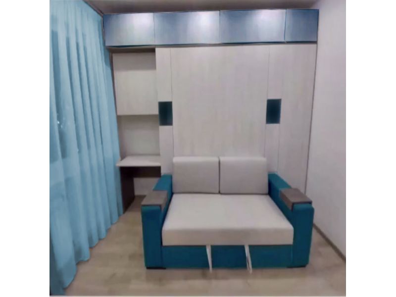 Наличие нескольких комнат, не препятствует расширению их функциональности. К нам часто обращаются обладатели стационарных спален, так как уже поняли сколько плюсов несет мебель-трансформер: днем легко заняться спортом или общаться с друзьями, комната не выглядит "грузно". Акцентами стал голубой цвет, он радует глаз.