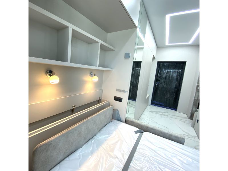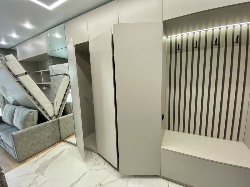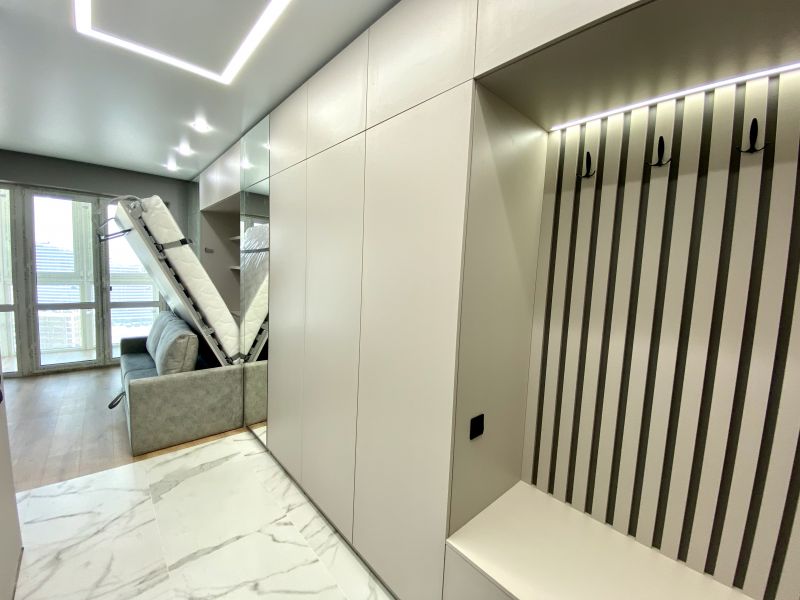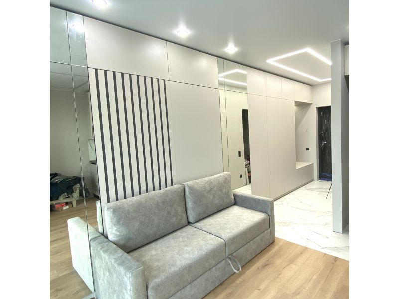 На руках у заказчика был дизайн-проект от интерьерного дизайнера. Мы проект доработали и создали прекрасную студию с шкаф-кроватью с зеркальными пеналами, кухней и прихожей.