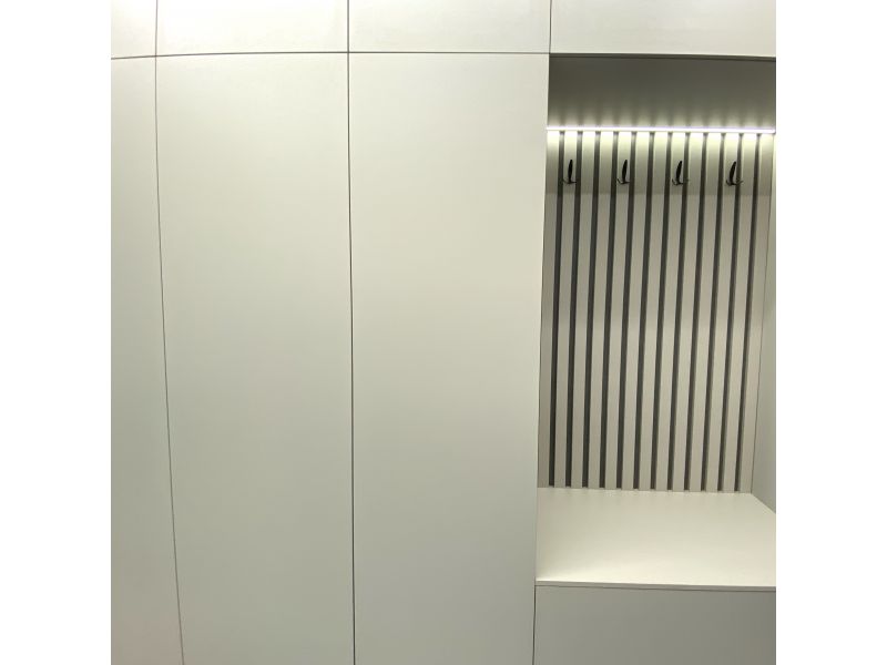 Особенностью проекта стали вставки из реек выкрашенные под лдсп Эггер "Кашемир". Они присутствуют на комбинированном фасаде кровати и в прихожей у входа.